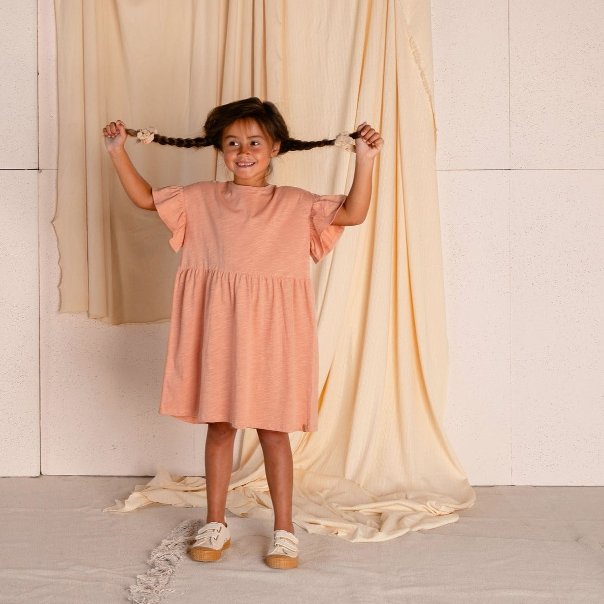De favoriete frill dress is er terug in een nieuw fris kleurtje 'peach'. Luchtige katoenen jurk om de zomers als spelend door te komen.