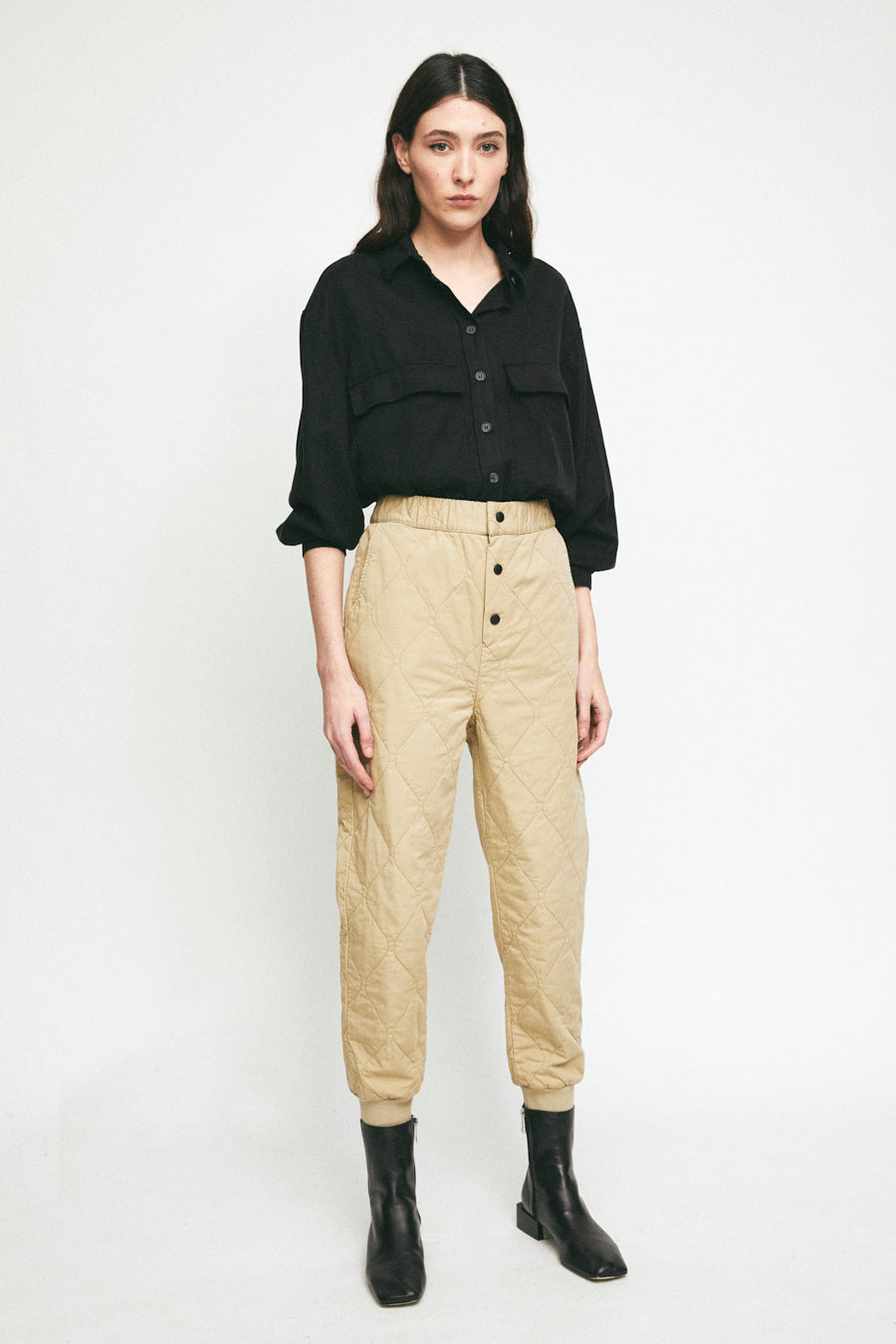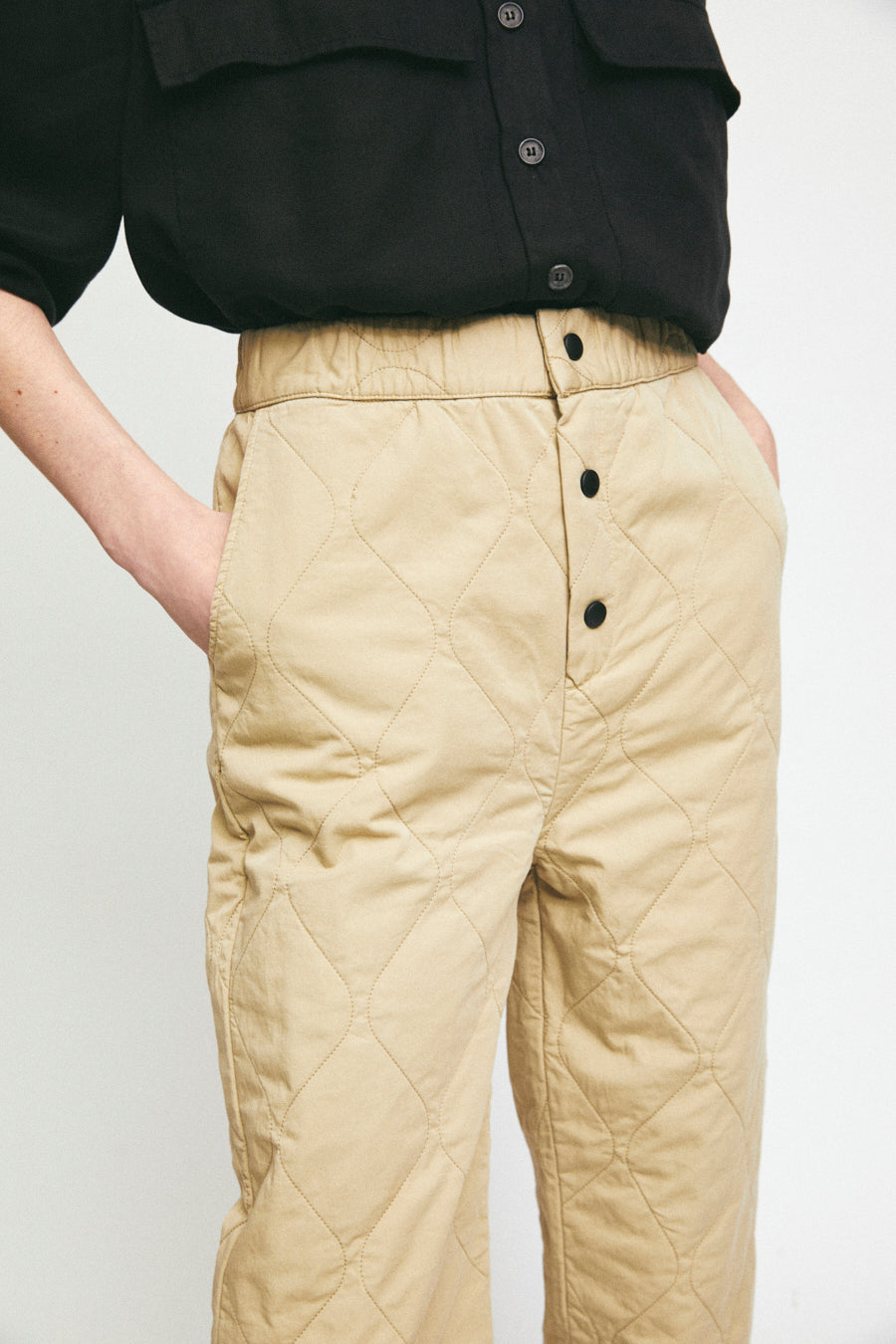 sand-coloured quilted trousers with press-stud fastening to give your nude outfits that extra touch